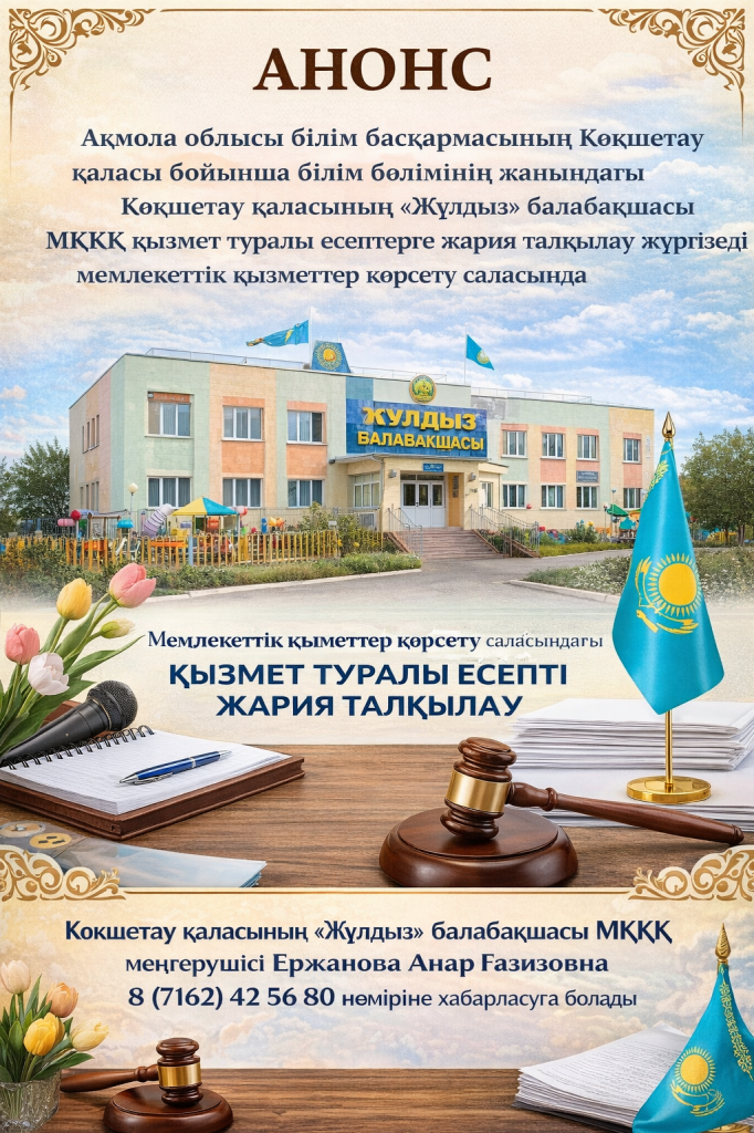 Ақмола облысы білім басқармасының Көкшетау қаласы бойынша білім бөлімінің жанындағы Көкшетау қаласының «Жұлдыз» балабақшасы МКҚК қызмет туралы есептерге жария талқылау жүргізеді мемлекеттік қызметтер көрсету саласында