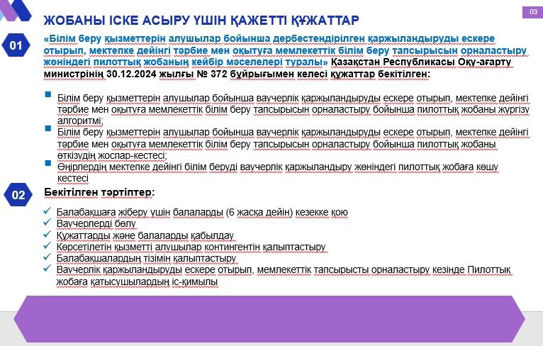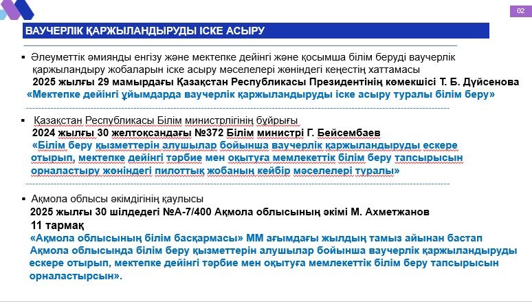 Ваучерлік қаржыландыру — мектепке дейінгі білім беру саласындағы маңызды жаңашылдық. Ол бәсекелестікті арттырып, ата-ананың белсенділігін күшейтеді және ең бастысы – әрбір баланың сапалы мектепке дейінгі білімге тең қолжетімділігін қамтамасыз етуге бағытталған