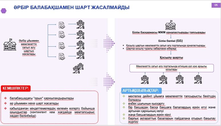 Ата-ана қай балабақшаны (мемлекеттік немесе жекеменшік) таңдаса, сол ұйым мемлекет бөлген ваучер бойынша қаржыландырылады.