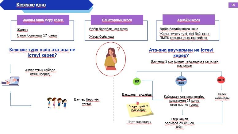 Бала тіркеледі – ата-ана баласын электрондық жүйе (мысалы aqmola.kz) арқылы кезекке қояды.