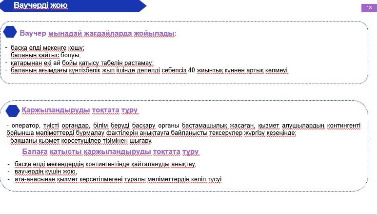 Ваучер бөлінеді – мемлекет әр балаға белгілі бір мөлшерде ваучер бөледі.