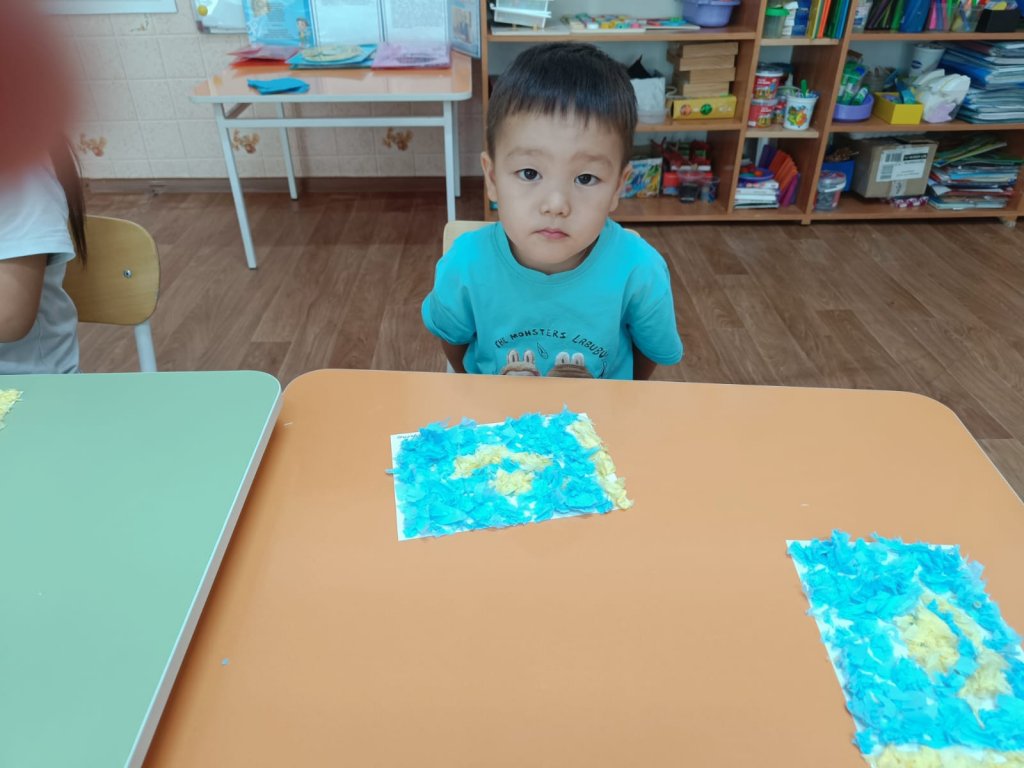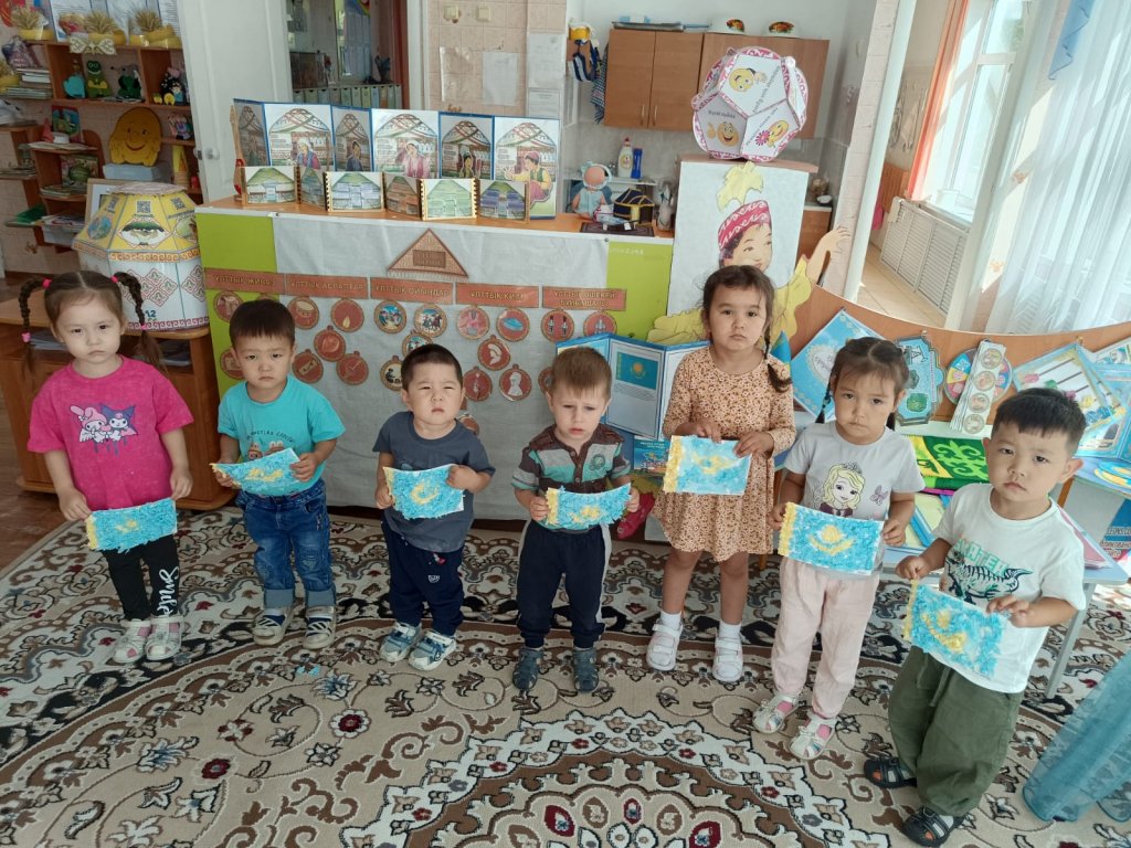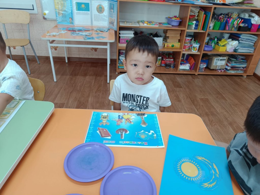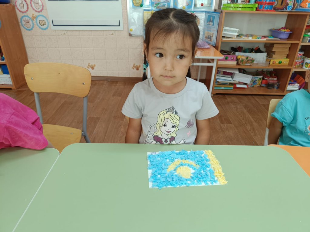 Балалар аппликация жасап, өз Отанына деген сүйіспеншілігін сурет арқылы жеткізді. Олар күн, тау, көк ту, даланы бейнелеп, өз елінің сұлулығын қағаз бетіне түсірді.