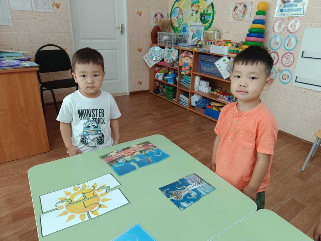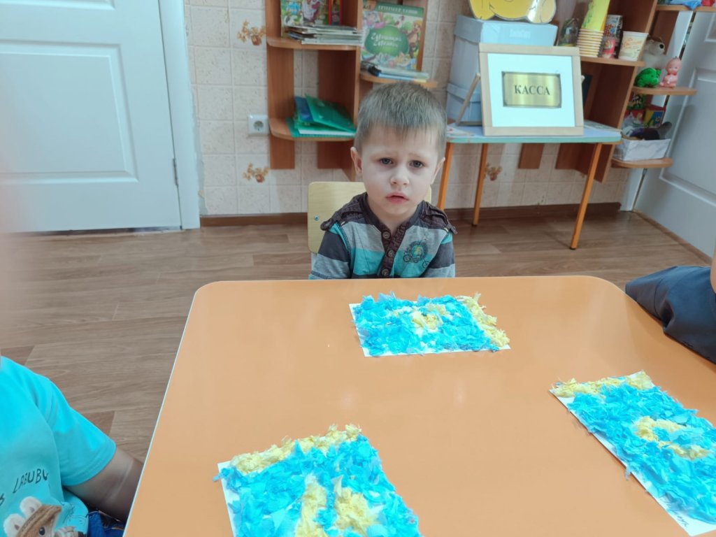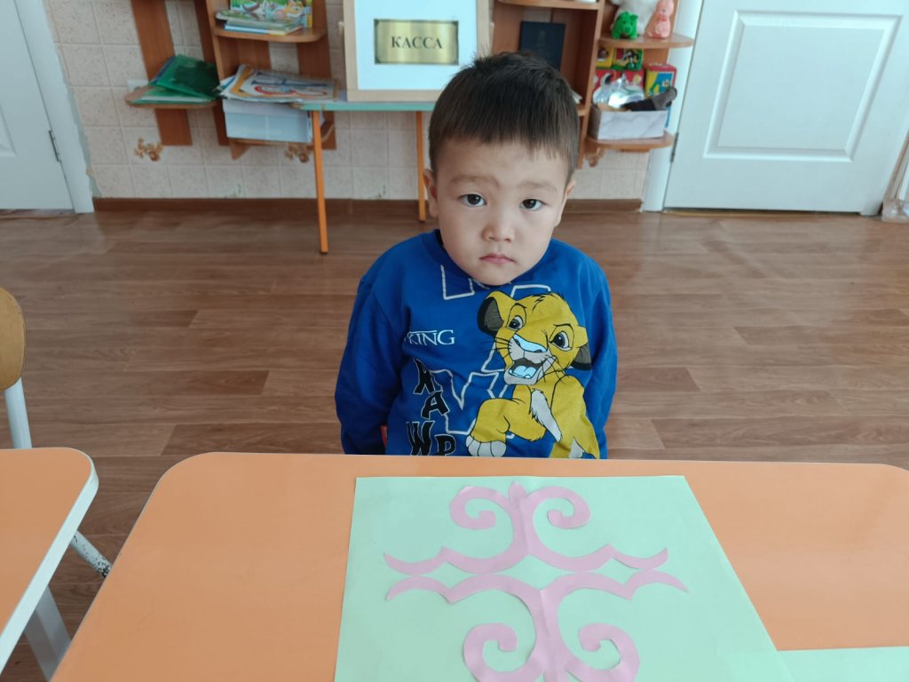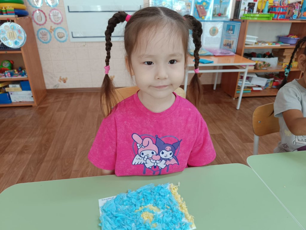 Балалар аппликация жасап, өз Отанына деген сүйіспеншілігін сурет арқылы жеткізді. Олар күн, тау, көк ту, даланы бейнелеп, өз елінің сұлулығын қағаз бетіне түсірді.