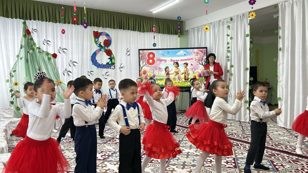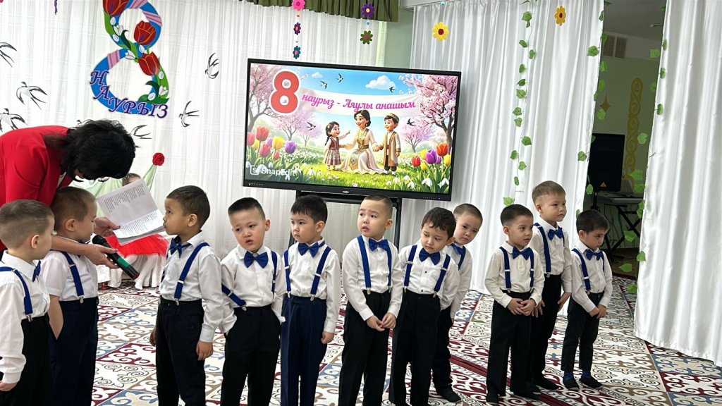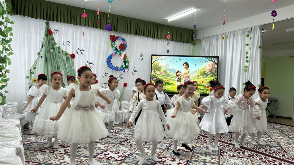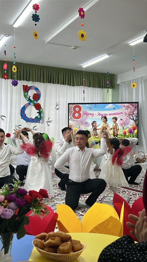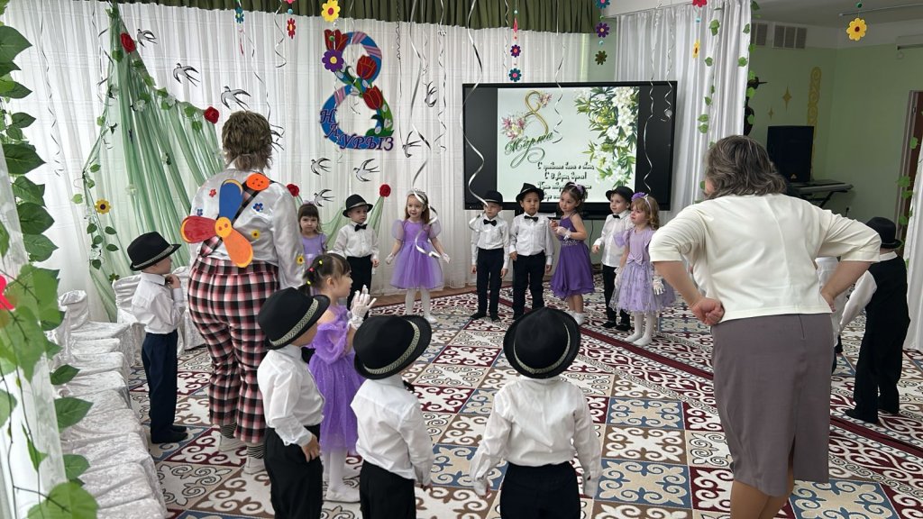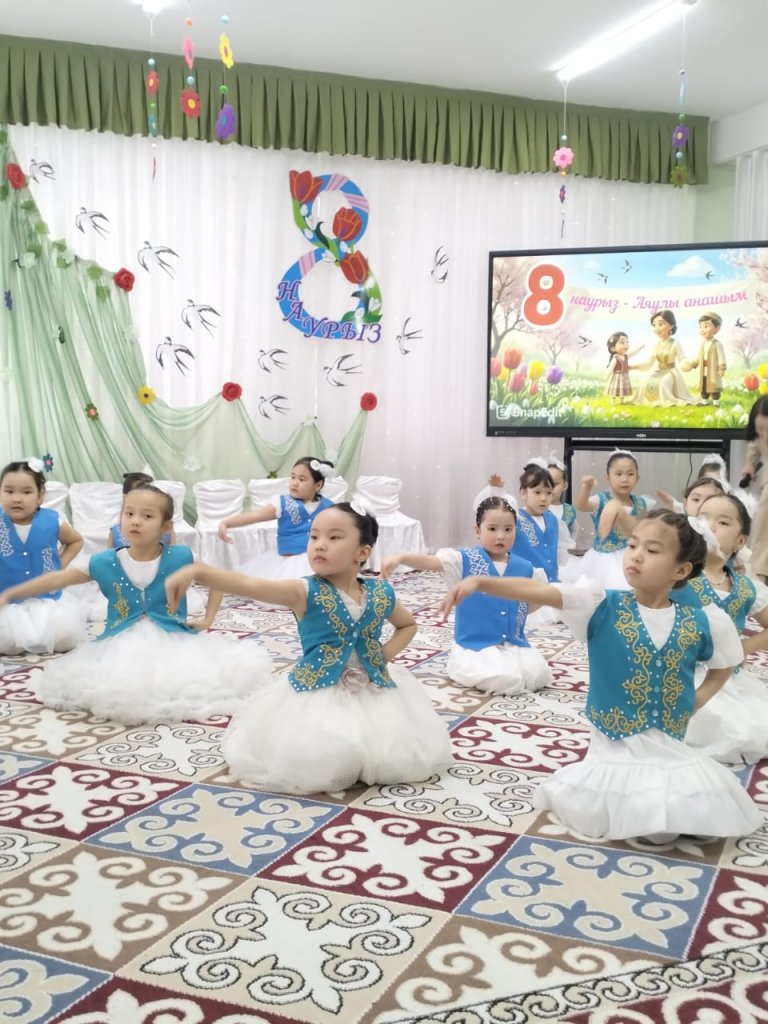 Халықаралық әйелдер күні – 8 наурыз мерекесі қарсаңында балабақшамыздың барлық топтарында мерекелік іс-шаралар өтті. Балалар аналар мен әжелеріне арнап жүрекжарды құттықтаулар, өлеңдер, әндер мен билер дайындап, өз қолдарымен жасаған сыйлықтарын тарту етті. Әсіресе №2 «Балапан» тобында өткен мереке ерекше әсерлі әрі қызықты өтті. Мерекеге ата-аналар белсенді қатысып, әкелер қыздарымен бірге «Әкелер мен қыздар биін» орындады. Бұл көрініс көрермендердің зор қошеметіне ие болып, көпшілікке көтеріңкі көңіл-күй сыйлады. «Балдырған» тобында мерекелік іс-шара ерекше форматта - «Мамочки TV – 2026» атты мерекелік телебағдарлама түрінде ұйымдастырылды. Бағдарлама «Пока все дома», «Большая стирка», «Смак», «Модный приговор», «Шоу Голос» және «Танцы без границ» атты түрлі телебағдарлама айдарлары арқылы көрсетілді. Мереке барысында бейнерепортаждар мен балалардан алынған шағын сұхбаттар ұсынылып, іс-шараны одан әрі қызықты әрі есте қаларлықтай етті. Балалар өз өнерлерін шабытпен көрсетіп, шығармашылық қабілеттерін танытты. Аналар да мерекелік бағдарламаға белсенді қатысып, түрлі қызықты ойындар мен сайыстарға қатысты. Соның ішінде балалар өздерін кішкентай сәнгерлер ретінде көрсетіп, аналарына ерекше сән үлгілерін дайындады. Тіпті ең кішкентай бүлдіршіндердің өзі мерекеге белсене қатысып, ойын ойнап, ән айтып, ата-аналарына шынайы күлкілері мен қуаныштарын сыйлады. Сонымен қатар би нөмірлерінің жоғары деңгейде дайындалғанын ерекше атап өткен жөн. Балабақша хореографының кәсіби жұмысының арқасында билер көркемдік тұрғыдан жоғары деңгейде қойылып, балалар оларды сенімді әрі үлкен ықыласпен орындады. Балабақшаның музыка жетекшілері де мерекенің жоғары деңгейде өтуіне үлкен үлес қосты — балалар әндерді әдемі әрі әсерлі орындап, мерекеге ерекше жылылық пен көңілді атмосфера сыйлады. Балалардың әсерлі өнер көрсетулері аналардың жүрегін тебірентіп, балаларына деген қуаныш пен мақтаныш сезімінен көздеріне жас алды. Мерекелік іс-шаралар жылы, достық әрі қуанышты атмосферада өтіп, барлық қатысушыларға көтеріңкі көңіл-күй, жарқын эмоциялар және көктемгі шаттық сыйлады